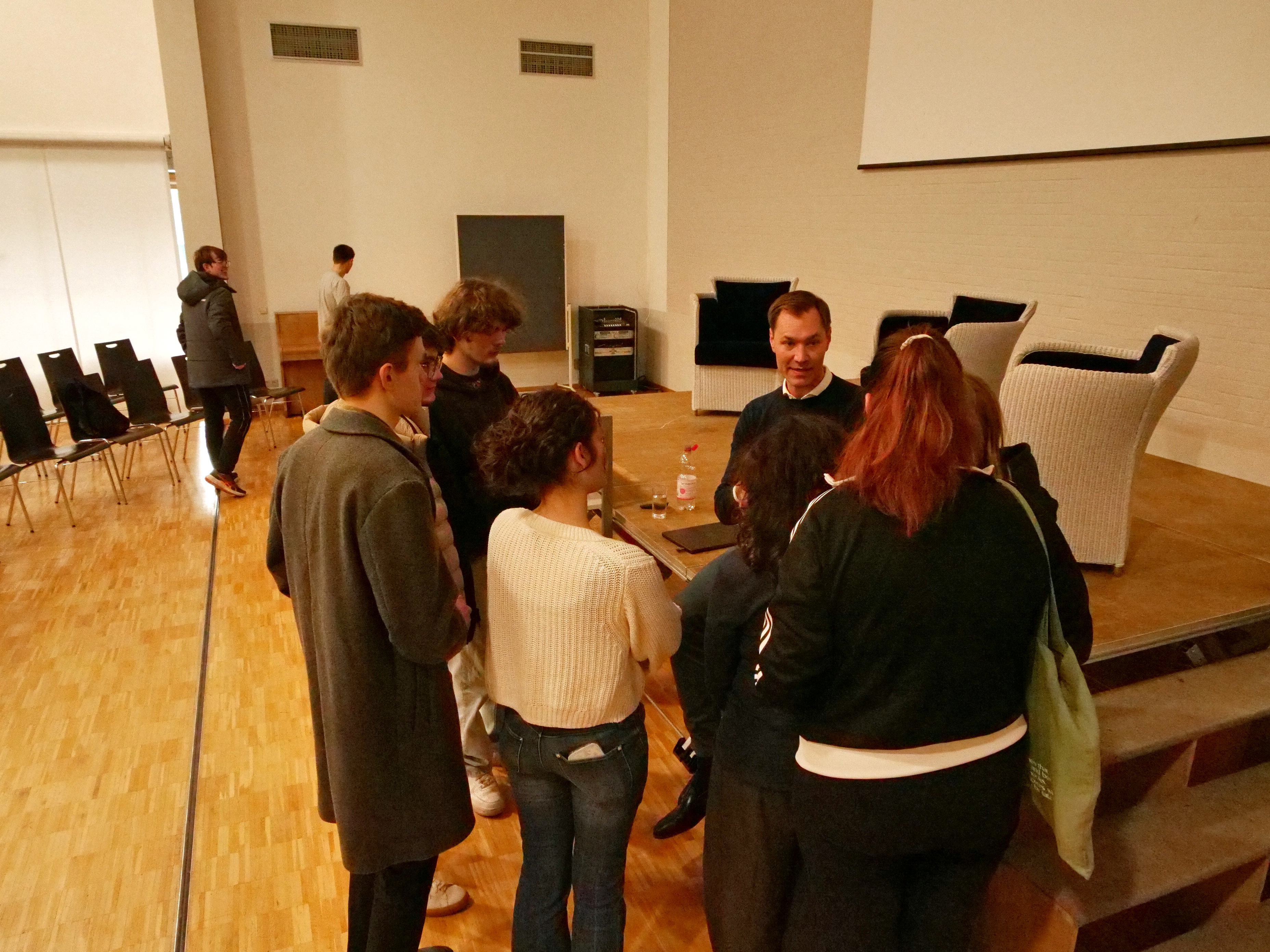 Julius van de Laar (Abitur 2002) ist Kampagnen- und Strategieberater mit langjähriger internationaler Erfahrung im politischen Campaigning. Zudem zählt er zu den gefragtesten Beobachtern der amerikanischen Politik und Gesellschaft.Im intensiven Austausch zwischen ihm und unseren Schülerinnen und Schülern der Oberstufe ging es vor allem um den amerikanischen Präsidenten Donald Trump – als Beispiel für einen politischen Wahlerfolg, der vor allem durch das Schüren von Ängsten (Verlust, Gefahr) und das Versprechen, diese beseitigen zu können, zustande kam.